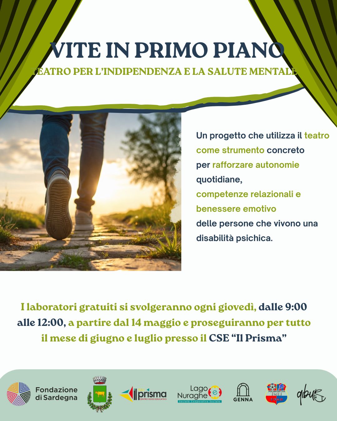 "Vite in Primo Piano – Teatro per l'Indipendenza e la Salute Mentale", promosso dalla Cooperativa Sociale Lago e Nuraghe presso il CSE Il Prisma di Isili. Il progetto nasce per sostenere persone con disabilità psichica attraverso un percorso innovativo che utilizza il teatro come strumento concreto per rafforzare autonomie personali, competenze relazionali e benessere emotivo.